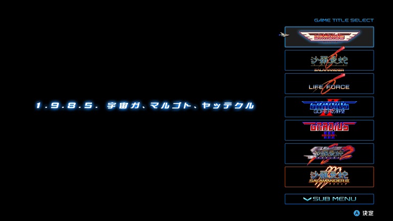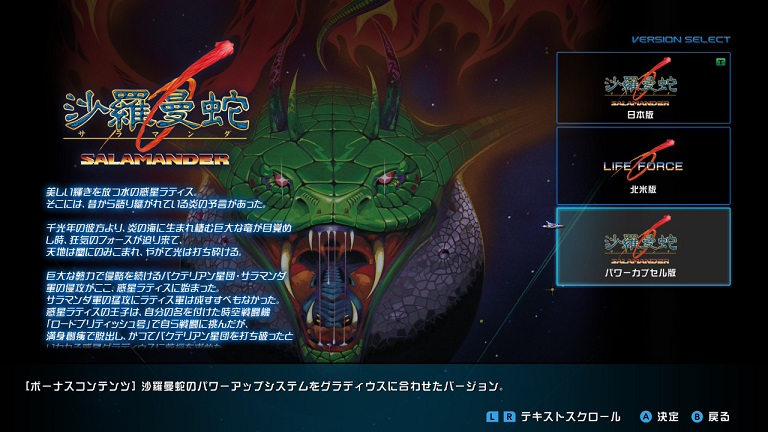 パワーカプセル版が出現。沙羅曼蛇のパワーアップって、オプションならオプションのパワーアップを取るタイプ。グラディウスは共通のパワーカプセルを取ると、画面下のリストがひとつ進むので好きなところでパワーアップする仕組み。パワーカプセル版の沙羅曼蛇は、文字通りパワーカプセルでパワーアップするばーじょんです。これって、ファミコン版沙羅曼蛇がこのシステムだったのよねえ。とりあえず、いろんなバージョンが含まれてますが、目玉は新作の「沙羅曼蛇V」ですかね。