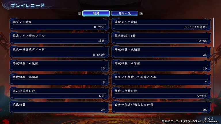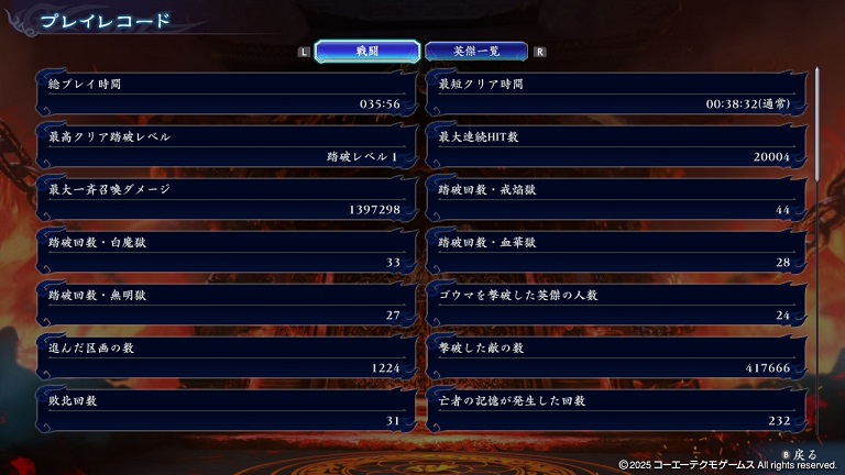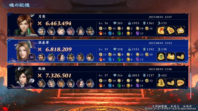 こう。得た業蛍火とか閻魔帳などの持ち帰りアイテム以外は保存されませんでした。残っているのはレベル35、総戦闘力680万のデータ。次にやるのなら、またこっからってことになります。なお、このモード、通常よりも新しく仲間になる者がほとんどおらず、印も入手困難ですよ。なのでスキル的な補強はあまりなし。上がった戦闘力は、多分レベル分かなあ。で、この10個のセーブデータは、私の現状通常モードをクリアしたときのデータで、それって道中ランダム要素がかなり絡んできて、得た仲間、得たアイテム、レベル、総戦闘力などは繰り返しプレイしても同じにならないでしょう。なおかつ踏破レベルによっても違ってくるはず。おそらく踏破レベルが高い方が強いデータになるっしょ。てことは