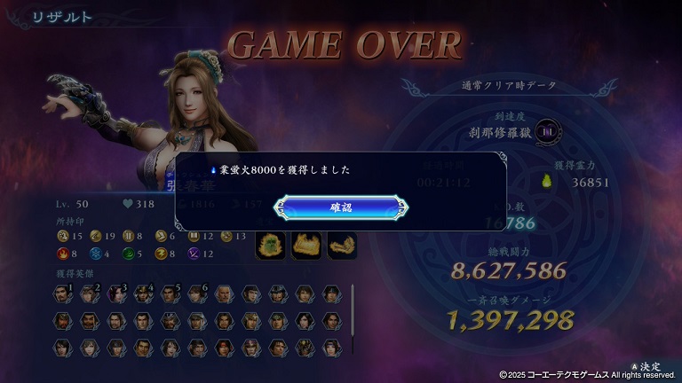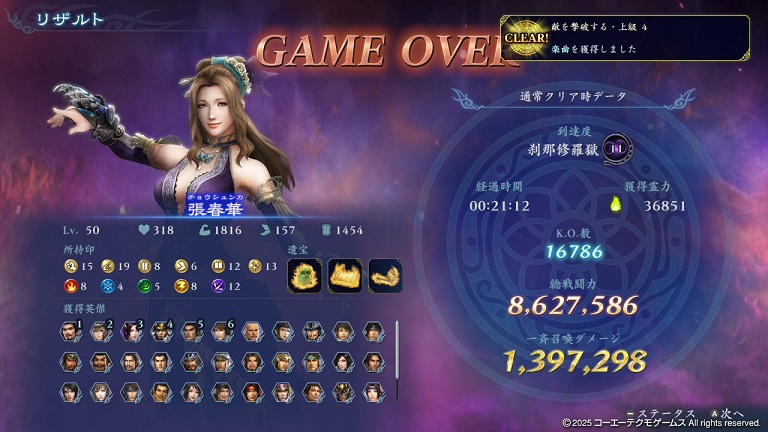 ゲームオーバーになりました。21分やって、レベル50、総戦闘力は862万。でこっから、