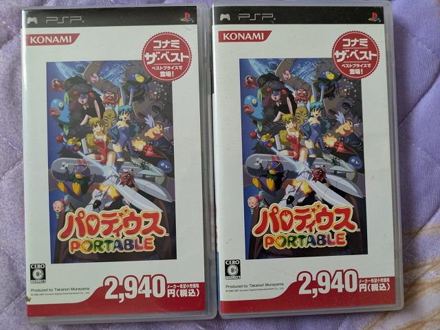 パロディウスとかグラディウスの話とかで盛り上がっておりました。もちろん、私が購入したグラコレの話などもしておりますよ。ただ、その人のゲーム環境、メインがスマホで、あとPS2止まりだという話。PSPは持ってないとのこと。任天堂機はなし。なので、「パロディウスコレクション」とか「ツインビーコレクション」とか出て欲しいという私の話には同意いただけるのですが、その人はできないんですよねえ。で、そんときはまだPSP持ってないというのは知らなかったので、ここはひとつPSP版のやつをスクショでも見せびらかすかー、いや実物持ってった方が面白がるかもしれん。と引っ越し以来の段ボールの中から発掘。そこでようやく気づいたこと。箱詰めするときにもまったく気づいてなかったのです。
