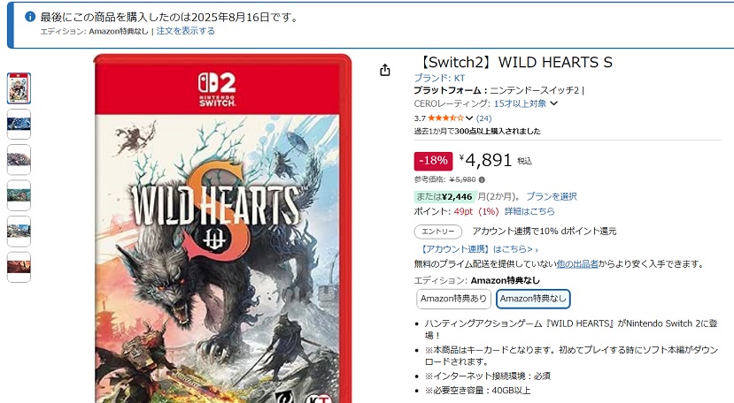 前回「バナンザ」を購入しましたが、結局「ワイルドハーツS」もポチりました。16日に注文して、えーと届くのが29日予定。遅くね? これにともない、スイッチ2に入れてるSDカードの中身を整理し、40G強空きをひねくり出しました。まあ、本体の方に「マリカワ」と「ディアブロV」を移動させただけですが。ともあれこちらも実際に触ってみるのが楽しみではあります。