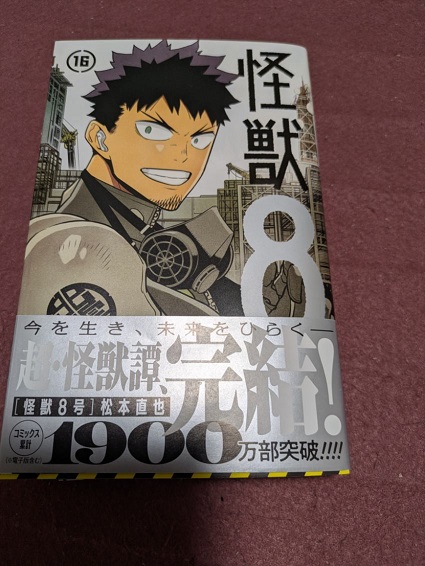 届きました。読む。うむ。面白かった。怪獣が災害として襲ってくる世界。主人公カフカは、小学生の頃、怪獣災害によって家を失ったりしており、幼馴染みのミナと防衛隊に入って怪獣を全滅させようと誓う。んで、現在32歳、防衛隊に入る夢を諦めている、というところから始まる。ミナの方は防衛隊のエースのひとりとして部隊を率いている。いろいろあって、怪獣を飲み込み、怪獣8号になってしまうカフカ。夢をかなえるために防衛隊に入るものの、という流れ。画像から分かる通り、16冊で完結します。ぶっちゃけた話、もっと長く伸ばそうと思えば伸ばせた内容ではあると思います。それを