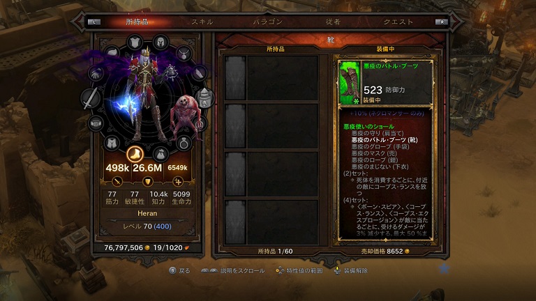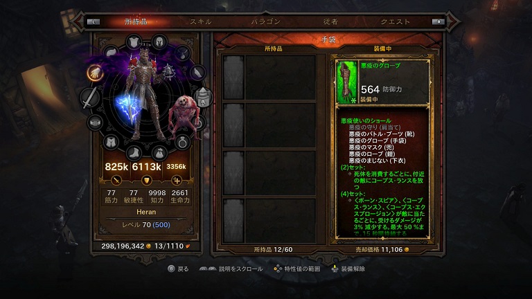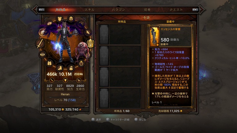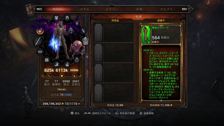 悩んだ末、肩当てをそのままに「エッセンスの掌握」を「悪疫のグローブ」に変更しました。結構やってみたら、これでも「悪夢の遺産」時よりはダメージ叩き出せますが、メインはミサイルになりました。逆にしたら爆弾になったんでしょうが、遠距離が行ける分便利。ただし、爆弾が複数ダメージなんでうまく回せば死体が大量にできますが、ミサイルは単体攻撃なんでねえ、1発で1体倒しても残る死体は1つなんだよ。