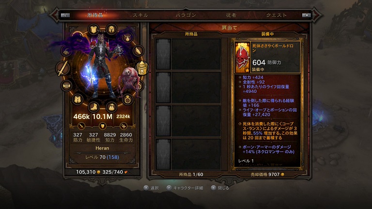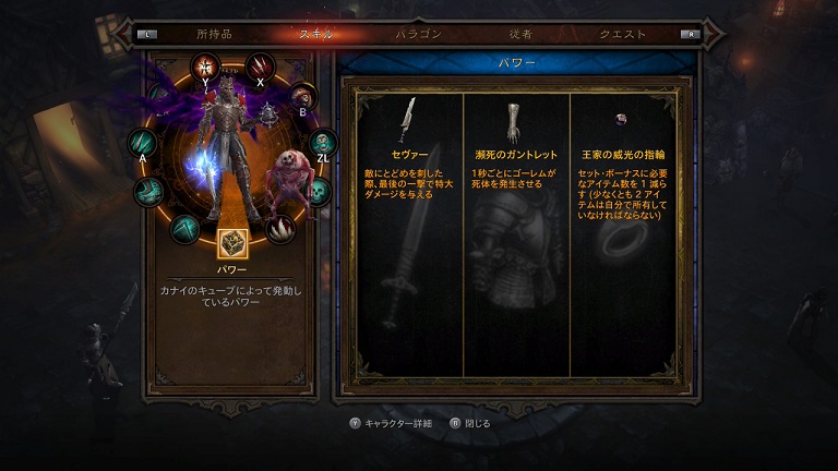 この13部位に装備品をブッ込んで、スキル等を発動させて強化していきます。スキルがついてるようなのはレジェンダリーとかセット・アイテムとかいわれる類いのもので、色的にはオレンジとか緑色の枠で表示されます。これとは別に、装備品をひとつ潰すことでスキル(パワー)を抜き出し、別個装備することができます。