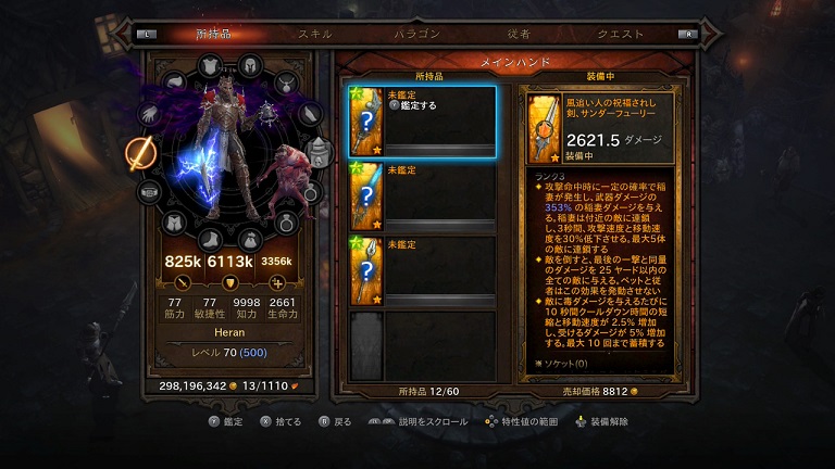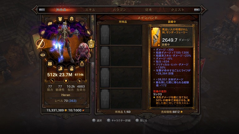これが武器のサンダーフューリー。3つほど特殊効果が書いてありますが、これはなんだっけ、名前忘れた、四小悪のソウル・シャードをランク3まで上げたのをつけております。これまでソウル・シャードの出てくるシーズン何度かやってますが、まともに四小悪の方は使っていなかったのですけどねえ。ついてる効果は、