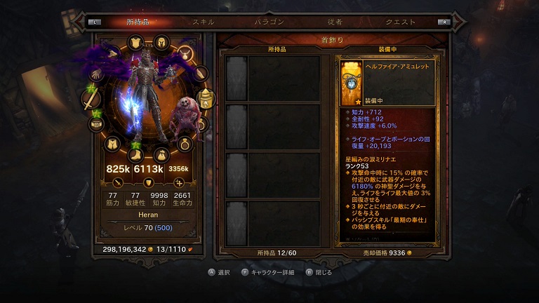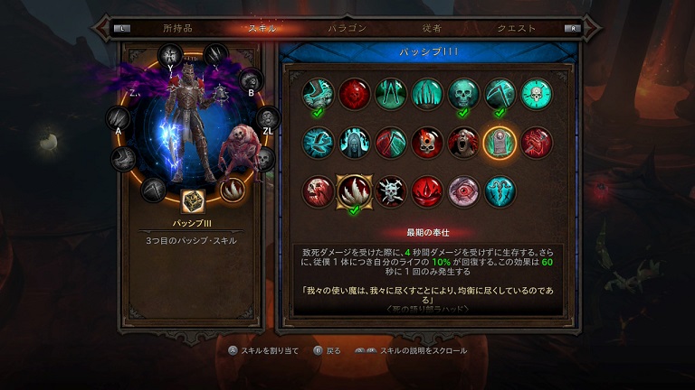 「最後の奉仕」スキルも保険として入れています。60秒に1回使用可能。即死ダメージをキャンセル、4秒間ダメージを受けなくなり、従者の数×10%回復。なおチェック入ってませんが、これヘルファイア・アミュレットのスキルとして発動させてますよ。加えて、