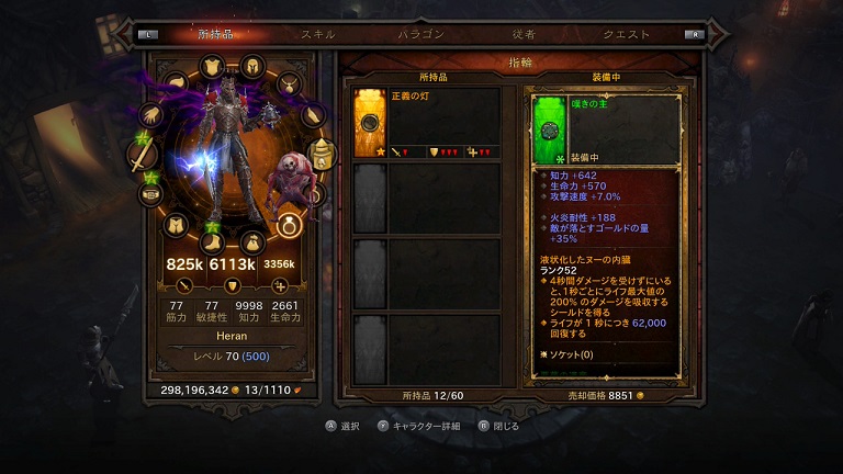 毎度お馴染み「液状化したヌーの内臓」も装備しております。20日時点では1秒につき62000のライフ回復。あと4秒間ノー・ダメだとバリアを張ります。もう少し耐えられなくなったら、ミリナエを外してダメージを分散化するモラトリアムを入れるかなとも考えてますが、方針としましては、「従者が死ななくなる+結束の指輪」のコンボでダメージを半減させるというものが優先。ただし従者が死ななくなる装備がまだ出てないのと結束の指輪のソケット付きが出てないのがなあ。