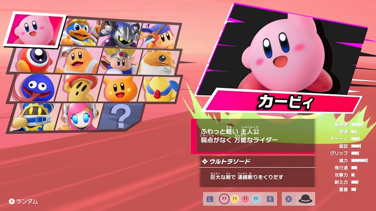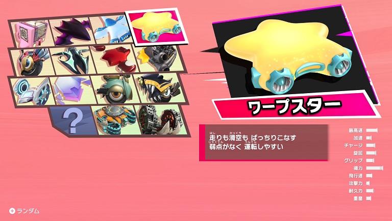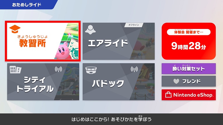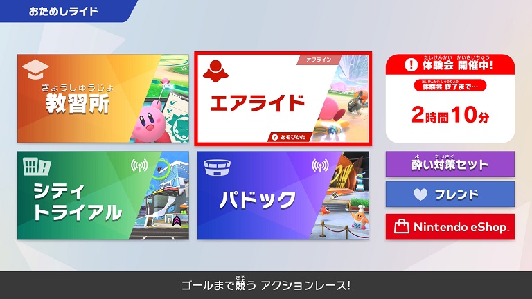 ふむふむ。なるほどね。反転してる部分はいじれない、と。なおかつアンテナマークのついてるついてないでオンラインで遊ぶのかオフラインで遊ぶのかが分かるのですね。なお、エアライドがオフラインでできないわけないんで、この体験版ではこういう設定になってるってことですね。それから、右側には