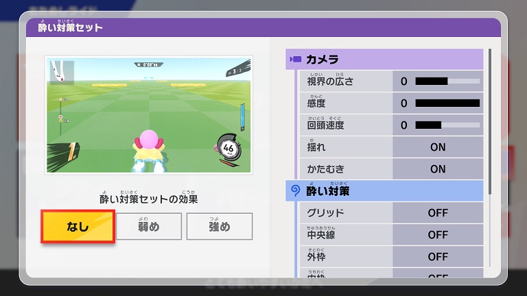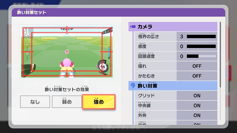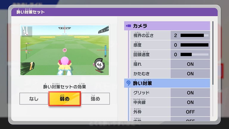 「弱め」と「強め」ですね。中央に照準みたいなカーソル。外側に線を入れることにより、視線を中央へ集中させるやり方ですね。製品版では右側にある要素を細かく設定可能。今回のはあくまで体験してもらうことがメインであり、体験してもらうために酔いが発動してもつまらないので、というとこでしょう。動きが速い上にわちゃわちゃするゲームですし。サークライもダイレクトで「酔い対策には力を入れた」といってましたし。私はとりあえず「なし」のままで。