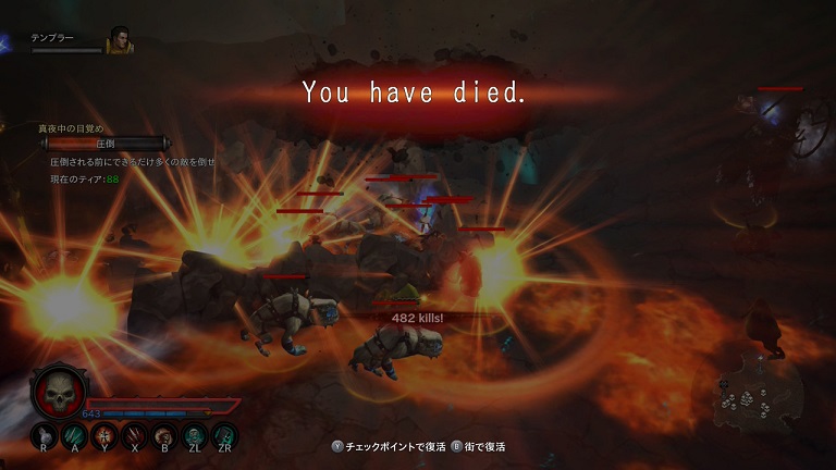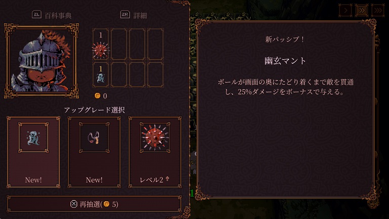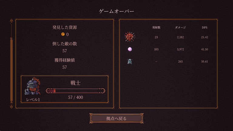 キャラがレベルアップ。3つの強化先が出て、選んでいくことで強くなります。んで。ゲームオーバーになりますと、