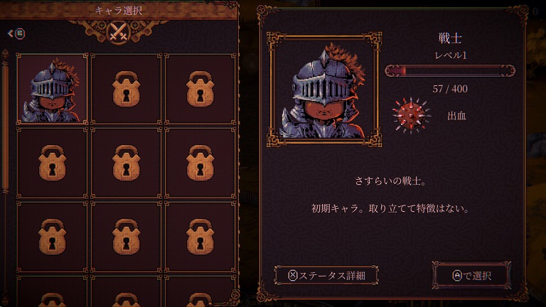 プレイした際の強化内容は破棄されます。ただしそれとは別に経験値がキャラに入りまして、上のスクショだと57経験値ゲット。400まで溜まるとキャラがレベルアップします。パラメーターに永続強化がかかる状態になりますね。まああれだヴァンサバとかローグライト系みたいな感じ。やるほど強化されていくと。