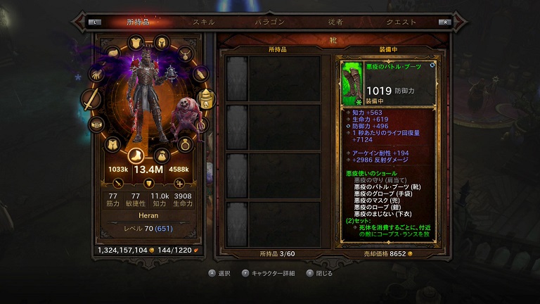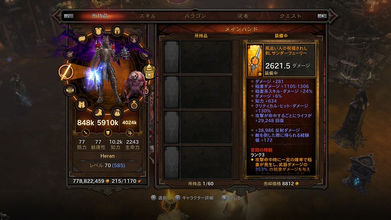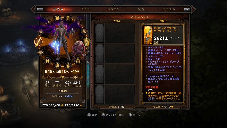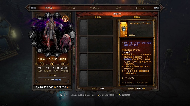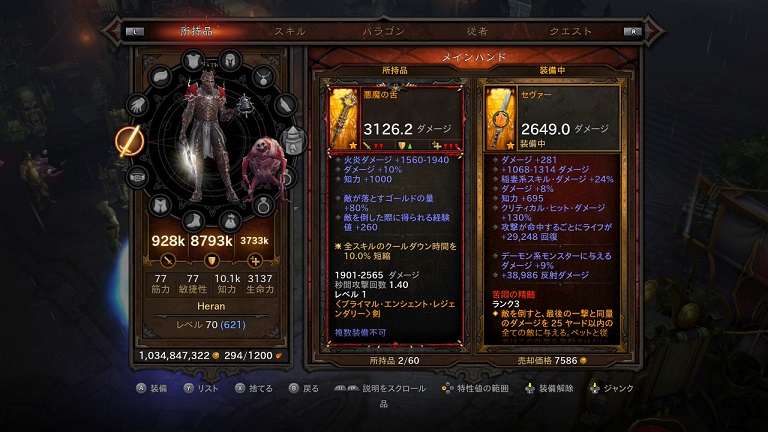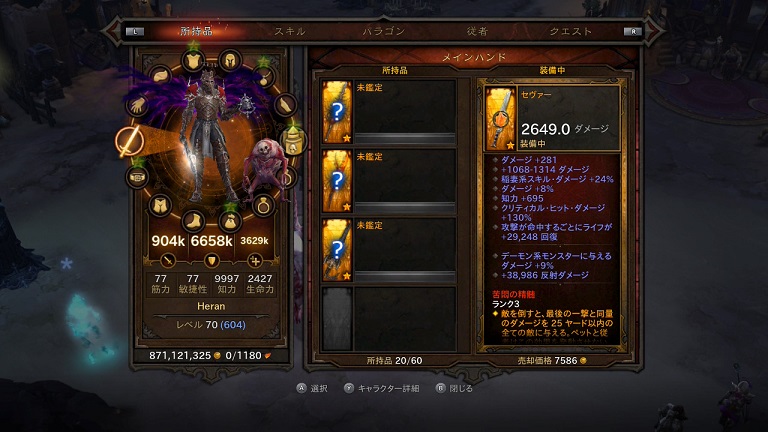 知力+1000とトチ狂ったもんがついております。セヴァーの方は苦悶の精髄についてるボーナスあるんかな、トータルで知力+695です。