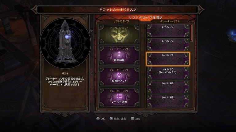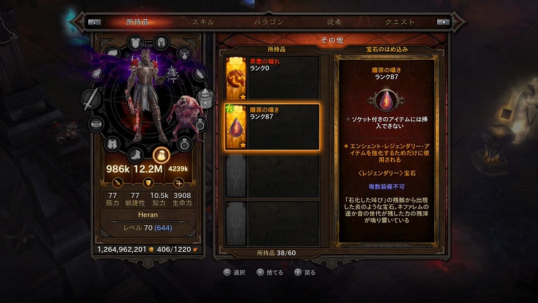 一般宝石最上級が×3、とレジェンダリー宝石が必要となります。レジェンダリーのランクによって強化の度合いが変わり、一般宝石の種類によって何が強化されるのかが変わります。ネクロマンサーに必要なのは知力なんで、知力を上げるトパーズが必要。レジェンダリーの方は、グレーターで入手して強化してるやつ使ってもいいんですが、この時点ではランク60くらいしかありません。に対して、以前お試しでやってみた