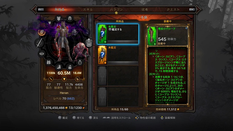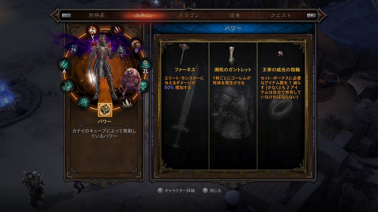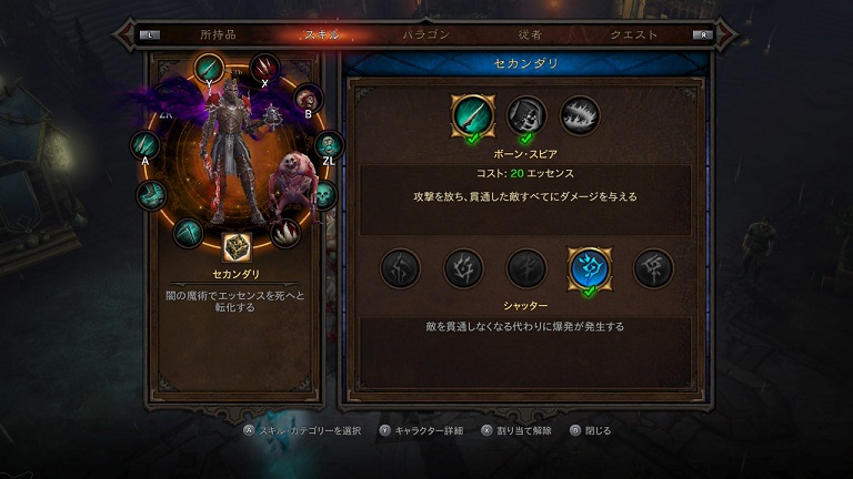 4セットが「ボーン・スピア」「コープス・ランス」「コープス・エクスプロージョン」命中時に、被ダメ3%減、最大50%までで15秒。6セットで死体消費ごとに「強化ボーン・スピア」チャージ+1。チャージ消費して次の「ボーン・スピア」が+6000%。さらに「コープス・ランス」「コープス・エクスプロージョン」も+6000%。ですな。「ランス」は骨ミサイルのことで、「エクスプロージョン」は爆破です。「コープス・ランス」は割り振りしてないリソース消費スキル。ええっと、