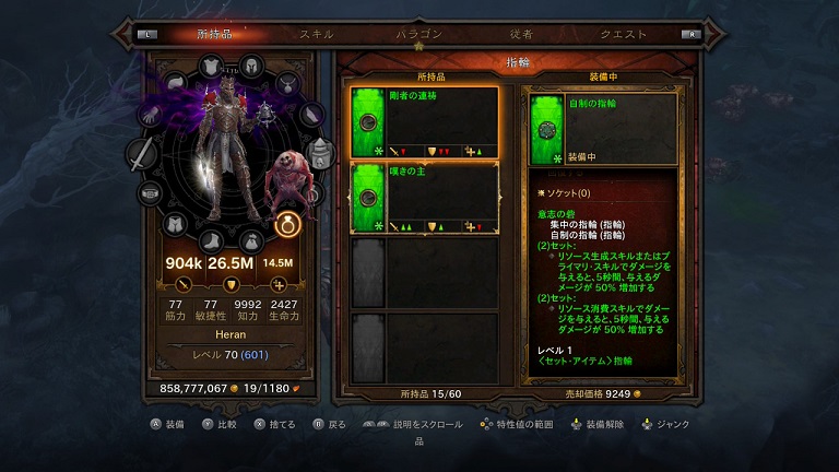 「剛者の連祷」と「嘆きの主」を外し、「自制の指輪」「集中の指輪」を装着。これも「悪夢の遺産」と同じく指輪2種で発動するセット・アイテムです。その効果は、