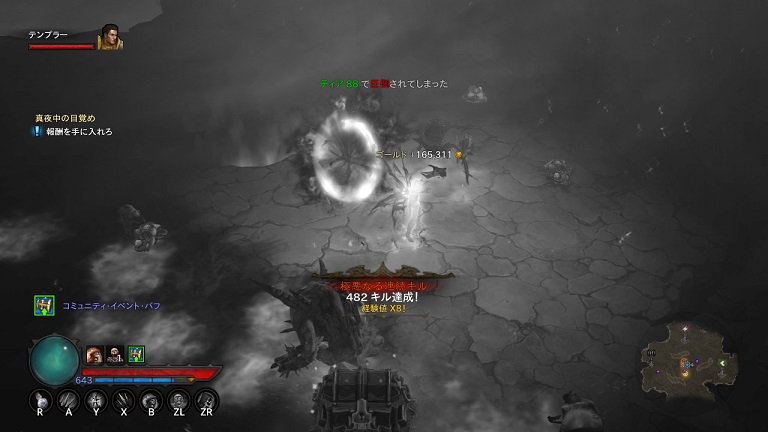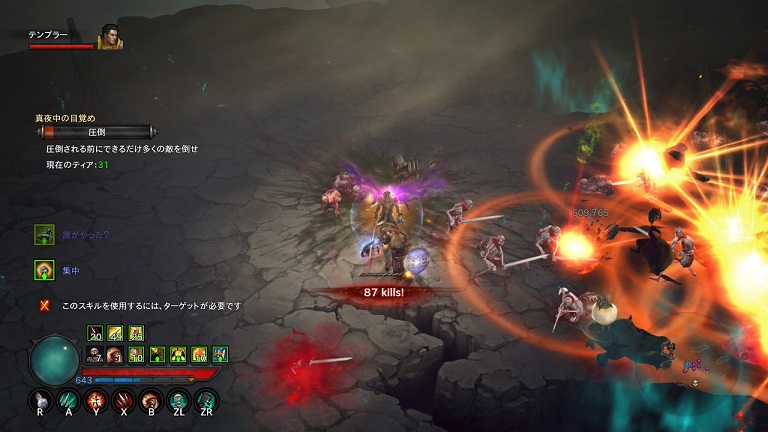 「石化した叫び」を使用して「木霊する悪夢」のポータルを開く。前にやったときは、なにぶん初めてだったんでよく分からないままやっておりました。今回は観察しつつ。えーと敵が群れで出現、それを倒していく、次の群れが出現、というサイクルでティアがどんどん上がっていく。敵がいると「圧倒」ゲージが上昇していき、ゲージ満タンになると終了ですか。敵を倒すとゲージが減ります。なるほどなるほど。それにしても爆発しまくられると動けるスペース狭くなってやりにくいなあ。ってことで、