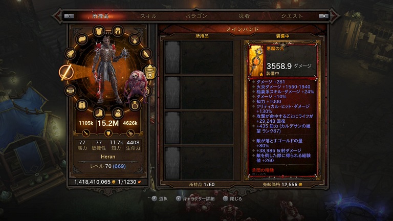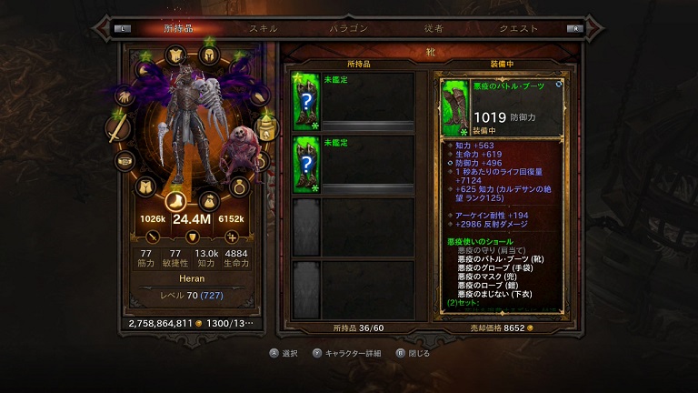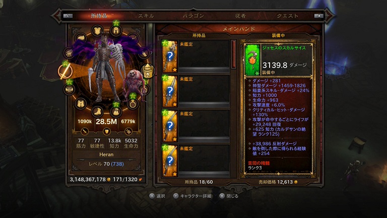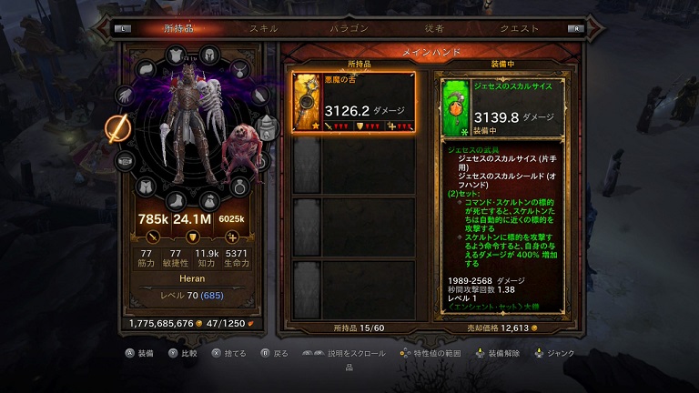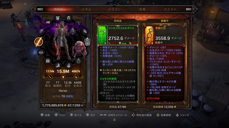 知力+1000ついてんだよね。悪魔の舌も+1000だったはず。悪魔の舌にごてごてついてる項目の大半は苦悶の精髄由来だし。スカルサイズ自体はセットシリーズで、これはスカルシールドと2つで発動します。サイスもシールドも複数所有してましたが、あえて使っておりませんでした。というのもこれのセット効果は、スケルトン関連で、あんまり重要視してなかったんですよ。えっと、正確には