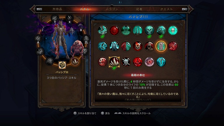 「最後の奉仕」の内容。「即死ダメージを受けた際に、4秒間ダメージを受けずに生存する。さらに、従僕1体につき自分のライフの10%が回復する。この効果は60秒に1回のみ発生する」とあります。クールタイムはよし。従僕ってどっからどこまでの範囲なのか。スクショに並んで写ってますミニゴーレムは扱いは「ペット」だわな。テンプラーは「従者」です。だったらゴーレムとスケルトンかな、となります。あと即死ダメージですよ。これ、思ったほど発動してないみたいなんですよ。私、「