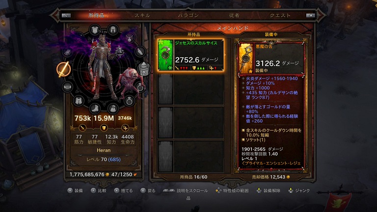 エンシェントじゃん。エンシェント・レジェンダリー、エンシェント・セット、そんでプライマル・エンシェント。いや、もうとりあえずソウル・シャードも地獄の炉の残り火も余りまくってるから強化しちゃおうとやって気づきましたよ。なので、エンシェント出たら入れ替えつつ、入れ替えたらカルデサンみたいな感じでひとつ。なお上げてるのは知力で、これって攻撃力だけじゃなくて防御力にも作用してくるので、最初の方でいった防御力爆上がりってのはこれが原因かと。