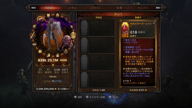 グレーターを81までクリアしてる状態で上限は1310。ノー・デスじゃなくてもクリアはクリア。そんで、血の破片の情報はキャラの一番下、右半分です。分母は消えてますが、