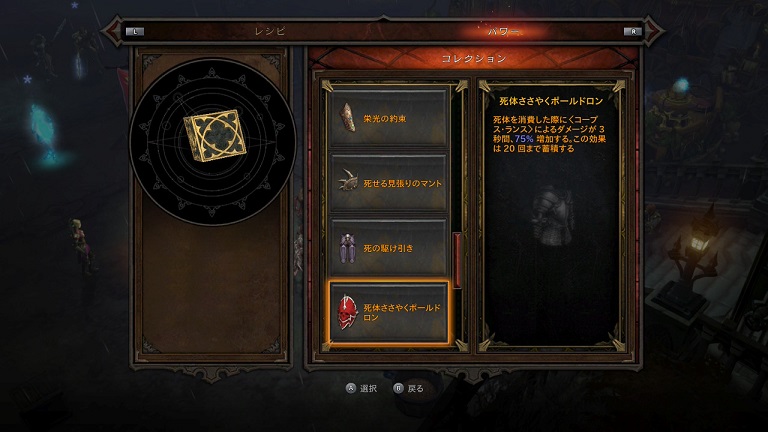 なお、スケルトンの標的に関するセット効果ですが、発動するとクールタイムはあるようですが、ほぼ一瞬なんで、立て続けの使用が可能で、瞬間的な火力が上がります。ただし、リフトの立ち上がりや死亡直後だとスケルトンが出揃ってないので微妙。ある程度数が溜まると一気に火力上昇できます。ただし、定期的に押さないといつの間にか切れてるので注意が必要。これにより、指輪×2の2種類の強化に加え、3つめの火力強化が可能になったというわけです。