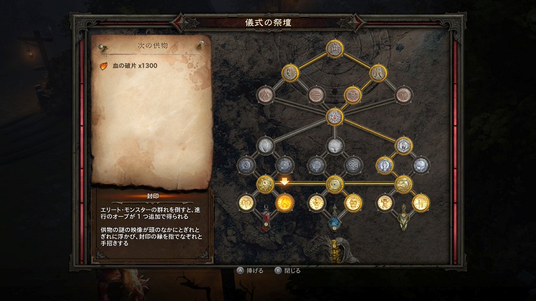 この辺。特にカダラガチャを入手するために右方向からツリーを攻めた結果、透過能力→カダラガチャ→素材分解→オーブ+1の順番になってしまいました。儀式の祭壇はマス目ごとに供物が決まっているわけではなく、開いたマスの個数で供物が決まります。なので入手する順番によってだいぶ変わってきます。今回のでいうなら、透過能力いらんかったので、逆回りでもよかったはず。透過能力はソウル・シャードで入手してますんで。
