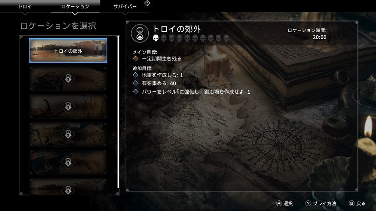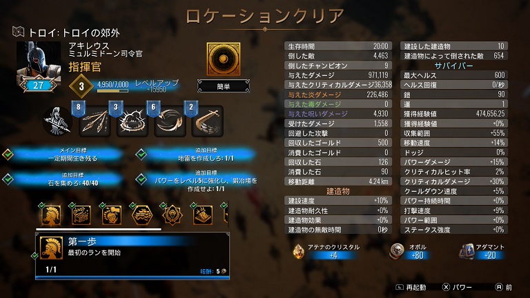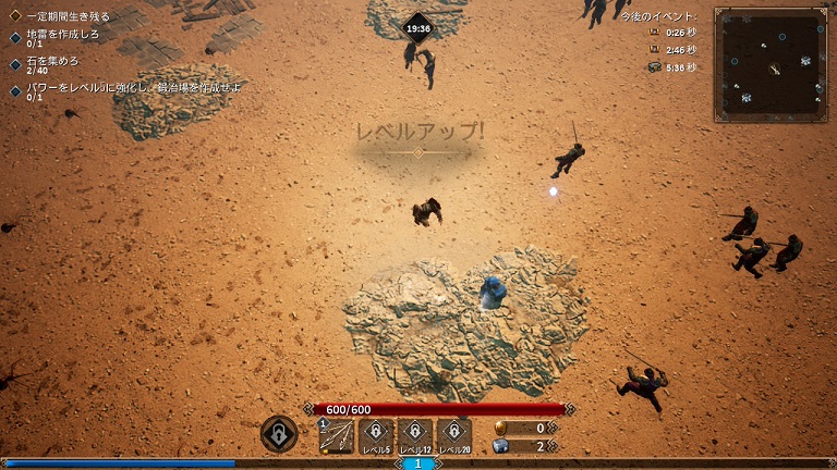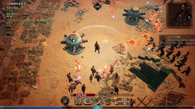 このゲームが他と違う点としましては、基本は制限時間いっぱい生き延びればクリアなんですけど、ステージによっては制限時間経過後にボスが出てきてバトルがあるパターンがありまする。もうひとつは左上の方にステージのメイン目標、サブ目標がありますが、素材の話とかが出てますな。画面にも出てます中央よりやや右下、変な突起みたいなやつ、これ石材。こうした素材を集めることにより、