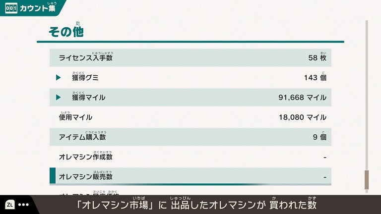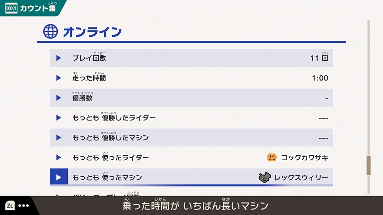 起動11時間くらいで、走った時間が5時間って……。グミ見たり、オレマシンやマイルショップ眺めたりとかしてた時間が多かったのかねえ。1戦あたりの時間が短いせいもあるんでしょうけど。んで、個別のモードもいろいろ情報が見れるようになっております。