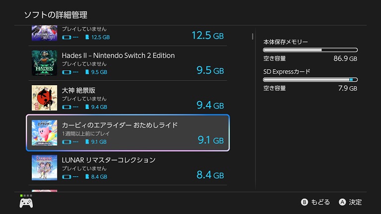 カービィのエアライダー」でしょうかね。前回最終日に開始して教習所だけ終わらせて力尽きたのでした。今回はいろんなモードを楽しんでく感じかね。