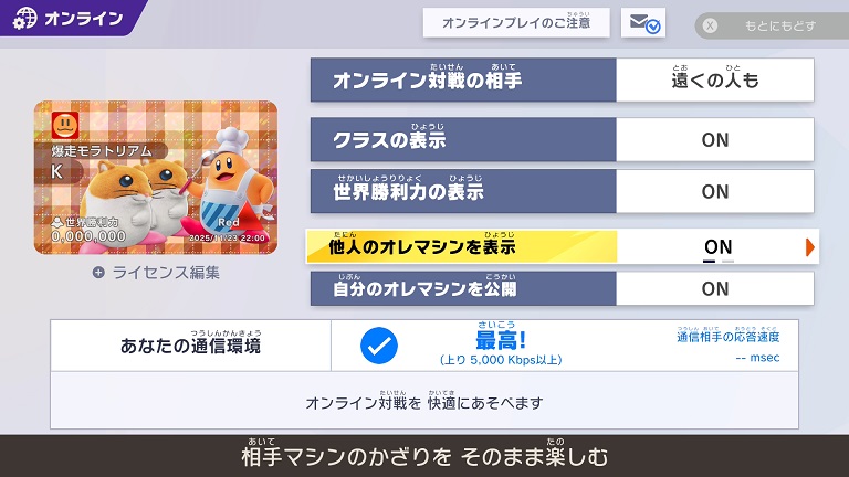 昨今回線弱々の民を自認しており、ネット対戦も控えた方がええかのう、と体験会のときもオフラインプレイをしていました。で、「つながる遊び」の設定のトコをふと覗いてみましたら、