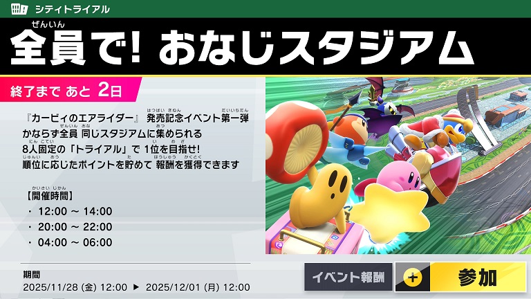 イベントは「シティトライアル」です。通常の「シティトライアル」は最大16人参加。2部構成で最初はアイテムを集めて成長させる。次はスタジアムを選択して、バトルって順位を決めるというもの。スタジアムは4種類がランダムで登場し、各自それを選択します。スタジアムは最大8人枠。9人以上が集まったら分割されます。つまり10人参加した場合、5人、5人のスタジアムに分割されると。自分マシンの成長具合でどのスタジアムに参加するかの駆け引きが発生します。飛行特化型になったので飛行タイプのコースにするのか、でも自分より強いやつがいるので別のスタジアムにするか、とか。今回のイベントはそもそも8人マッチングで、みんなして同じスタジアムにブッ込まれるというもの。