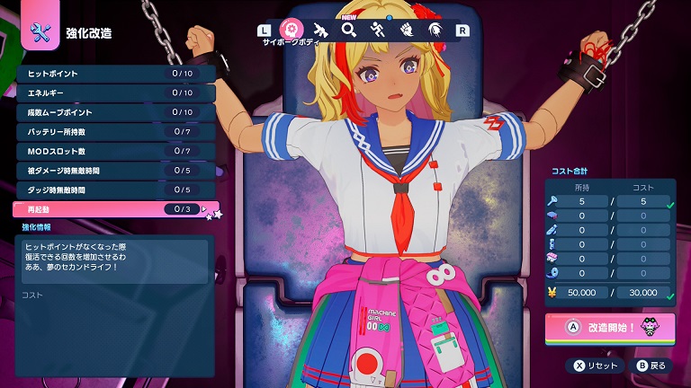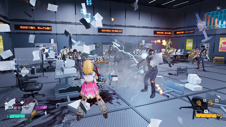 主人公たちはすでに改造されておりまして、素材やお金を持ち帰ってそれによってパワーアップすることが可能です。基本、道中入手した武器やらはゲームオーバー時にロストします。ビルの特殊フロア以外はランダム設計、敵を倒しながら次フロアへの階段を探して上がっていく形。