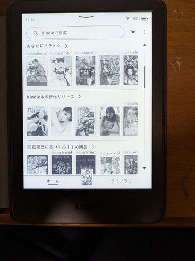 画面表示が16階調グレースケールです。つまりモノトーン。おそらく、他の端末だとカラー対応のものもあるんでしょう。あ、調べてみたら今年カラー表示の上位機種も出てるっぽい。カラーのイラストや写真を眺めるにはちょいとどうなのか、ということで、小説などの文字特化って感じ少なくともこの端末は写真などの記事がある雑誌には向いてないかな。私、