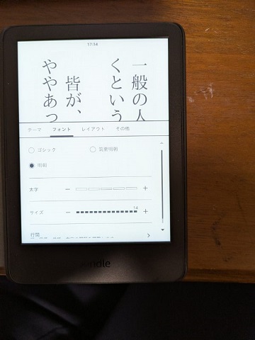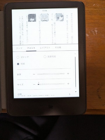 文字は15段階くらい大きさ設定できます。上のスクショ、最初の2つが文字大きさ3、次のが1ですな。大きさを切り替えますと、1行あたりの文字数も変わり、1画面あたりの行数も自動で変更されていきますよ。最後のが最大。ただしこういう自動変更になるので、