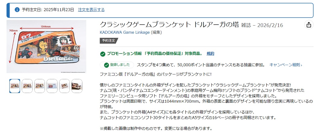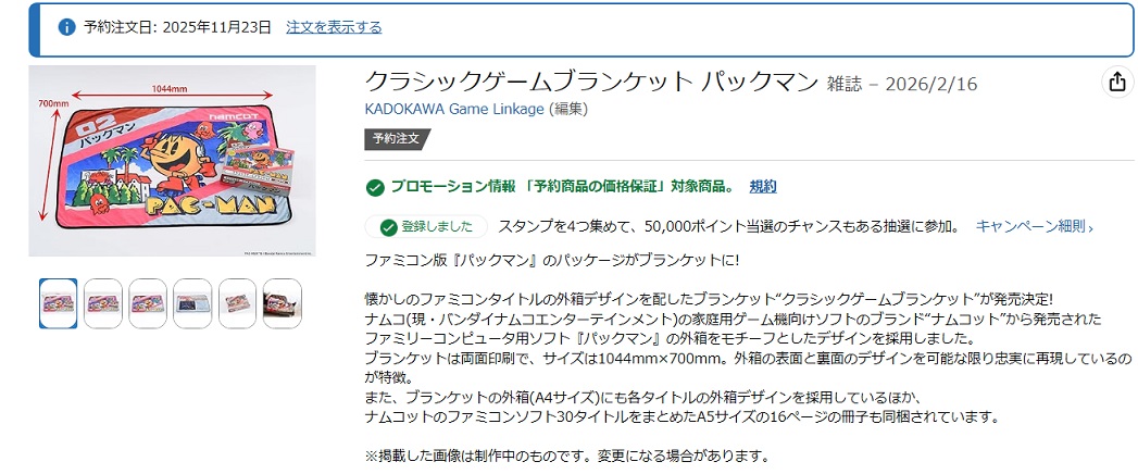 その手のニンゲンに、ナムコットでござるよ。しかもブランケットのデザインは、表裏のパッケージ。ぎゃー。今回は2月に3種類発売されるそうで、パックマンとゼビウスとドルアーガ。迷うことなく、