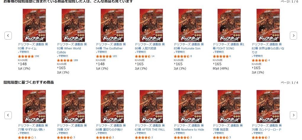 「ドリフターズ」のまだコミックに収録されてない単話もの(連載版)。計算しますと、あと5話かそこらくらい新しく出ないだろうってことで、とりあえず続きを読みたいなあと。私が読んでなかったのが9話くらいあって、5話、4話くらいに分けて購入しいました。前半買ったときに、オススメがひどいことになりました。