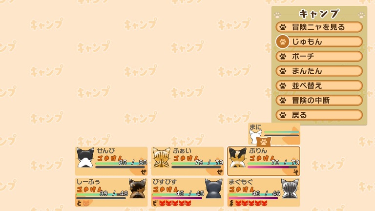 キャンプ画面。選択の中に「じゅもん」はあっても「スキル」はありませんな。で、各キャラ表示の中で、えーとそうですね「びすぴす」でいうなら、「ごきげん」はキャラの状態で、これが「どく」「マヒ」「石化」「スネスネ」「ガンムシ」などの状態異常に変わることがあります。あ、「スネスネ」=死亡、「ガンムシ」=灰ですウィズでいうなら。で、状態下の45/45がHP、その下にある紫色のバーがMPで、「ビ」が職業(ビショップ)、その横にある赤い猫マークがSPになります。で、気づいたことがありまして、