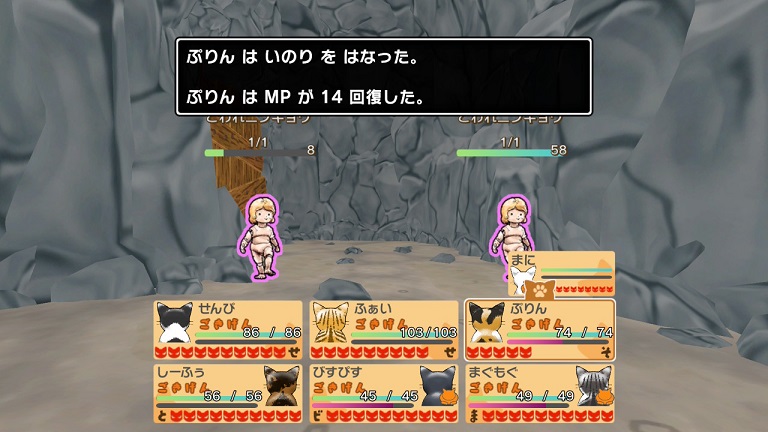 コマンドのカーソル記憶がないことですかね。まず戦闘時コマンドが「たたかう」「がまん」「じゅもん」「スキル」みたいな感じに並んでおりますが、ターンが変わるとカーソル一番上に戻ってしまうんですよ。ボタン連打で「がまん」とかできないんだわ。キャンプ画面の「じゅもん」とかでも、使用キャラ選択→呪文選択→対象選択→実行の流れになりまして、実行後に、どこに戻るかというと、対象選択なんですよたしか。そのときカーソルがパーティーの先頭に戻ってるという。なので連続して同じ相手に回復呪文かけるの面倒。お店だとカーソルはアイテム選ぶとそのまんまなんですけど、個数選択ができません。まとめ買い、まとめ売りはできませなんだ。この辺りは、もう少し改善してくれると遊びやすくなった気がします。